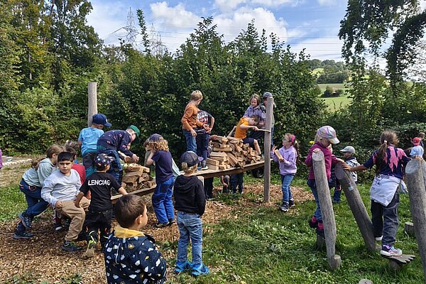 Der Heimweg wurde auf den direkten Weg zum Schulhaus aufgenommen. Der Leitsatz «Wir pflegen einen wertschätzenden und wohlwollenden Umgang miteinander» wurde bildlich mit Seilen gespannt von Schüler zu Schüler. Und gelebt wurde dieser Satz schon den ganzen Tag bzw. die ganzen Schulwochen.